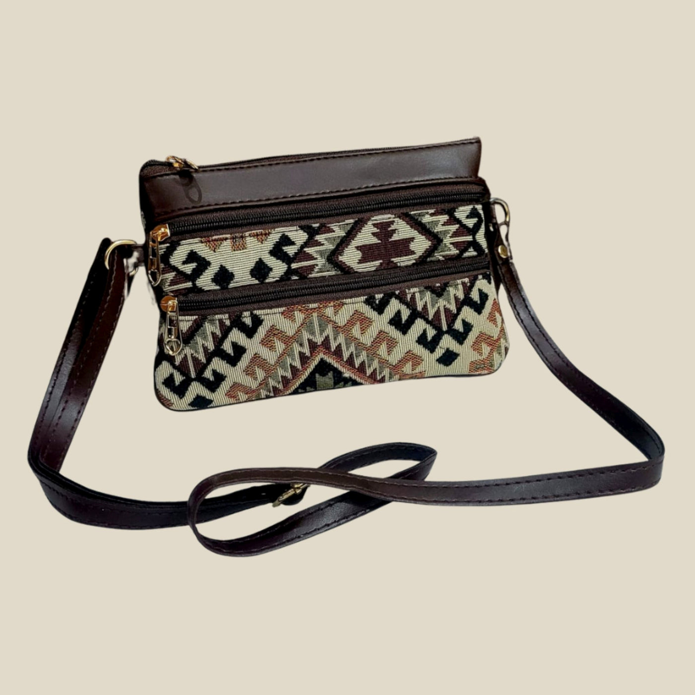 Handmade Southwestern Tribal Sling Bag – Faux Leather & Dual Zipper Design