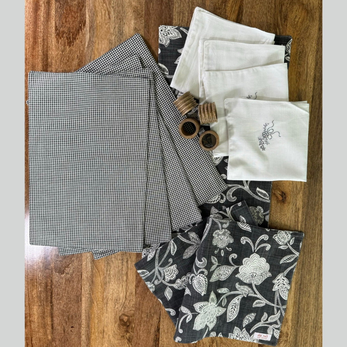 Enhance your dining experience with our Printed check Table Decor Set. This elegant set includes a checkered cotton runner with delicate lace trim, coordinating printed cotton placemats, and luxurious embroidered linen napkins. Perfect for both casual and formal settings, this set adds a touch of sophistication and charm to any table. Durable, stylish, and easy to maintain, it’s an ideal choice for elevating your home decor.